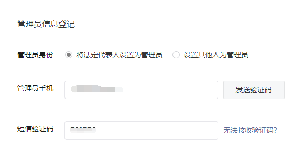 6、管理員信息登記,可以是法人,也可以是法人授權(quán)的管理員,輸入手機號碼和驗證碼