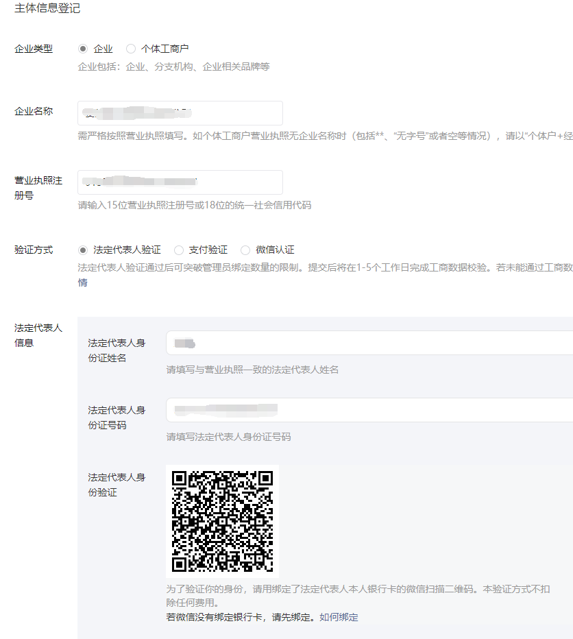 5、主體信息登記,按照營業(yè)執(zhí)照上的信息來填,公司名稱還有營業(yè)執(zhí)照號碼,然后法人掃碼驗證
