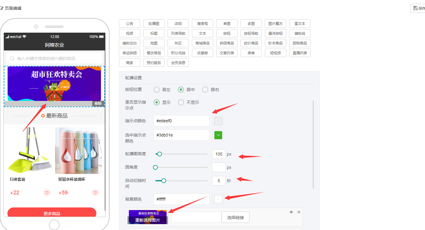 比如需要更換輪播圖,鼠標(biāo)點(diǎn)中它,左邊的上傳圖片 就可以傳新的圖片,同時(shí)可以設(shè)置連接,和大小,樣式