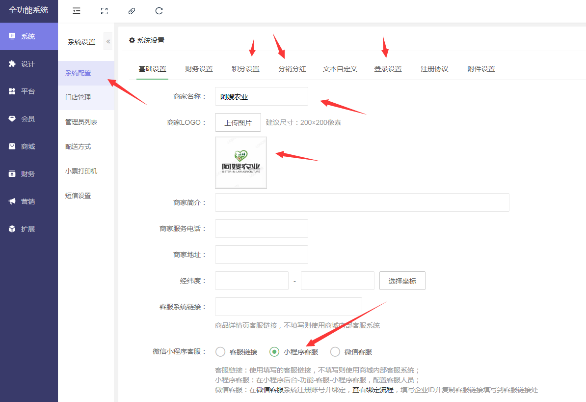 系統(tǒng)設(shè)置,可以設(shè)置名稱,LOGO和相關(guān)信息,可以把自己需要的積分規(guī)則,分銷,登錄等設(shè)置好