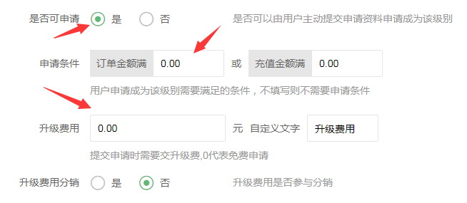編輯分銷會(huì)員,這里就是申請(qǐng)升級(jí)的條件,可以滿多少金額,或者直接收費(fèi)升級(jí)