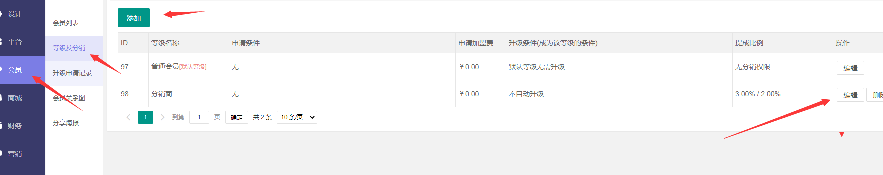 然后是會(huì)員管理,和等級(jí)分銷,可以直接編輯默認(rèn)的分銷設(shè)置,也可以添加更多的會(huì)員等級(jí),進(jìn)行升級(jí)的條件設(shè)置。