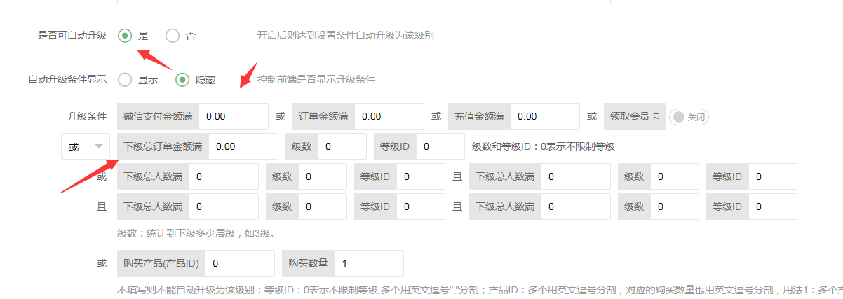 如果有多個(gè)會(huì)員等級(jí),可以設(shè)置自動(dòng)升級(jí)的條件,比如消費(fèi)滿多少,下級(jí)消費(fèi)滿多少,或者拉了多少個(gè)哪個(gè)等級(jí)的下級(jí),才能自動(dòng)升級(jí)