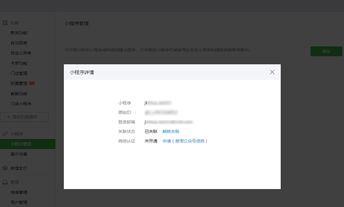前往微信公眾平臺(mp.weixin.qq.com)登錄公眾號->小程序->小程序管理->已關(guān)聯(lián)小程序->詳情-申請